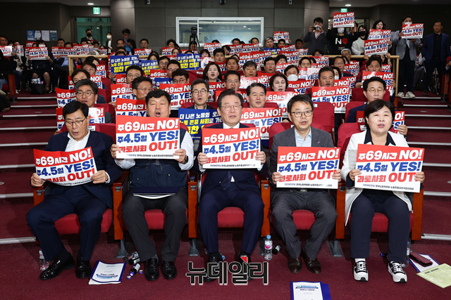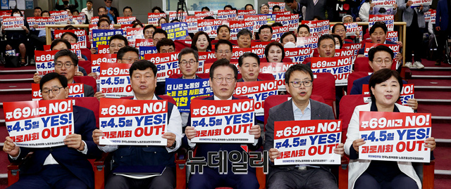이재명 더불어민주당 대표 및 참석자들이 20일 국회 의원회관에서 열린 제5기 전국노동위원회 및 제2기 노동존중실천단 출범식에서 피켓을 들고 구호를 외치고 있다.