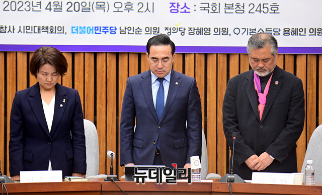 이태원 참사 진상규명 특별법 공동발의 기자회견이 20일 국회에서 열린 가운데 참석자들이 희생자들을 위해 묵념하고 있다.