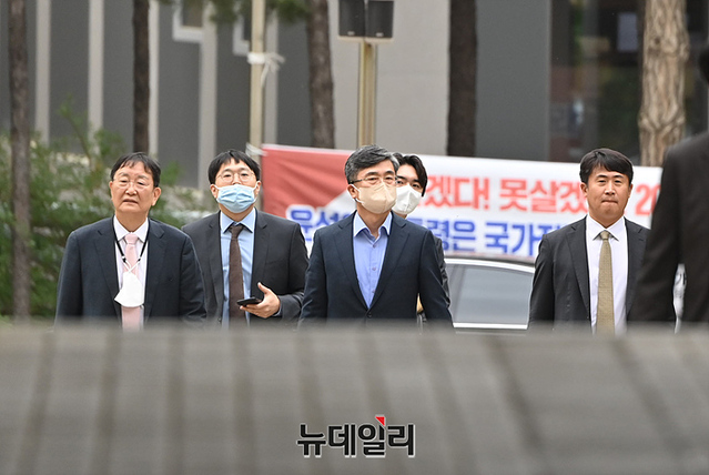 서해 공무원 피격 사건을 은폐하려 한 혐의로 기소된 서욱 전 국방부 장관이 21일 오전 서울 서초구 중앙지방법원에서 열린 '서해 피격사건' 관련 공판에 출석하고 있다.