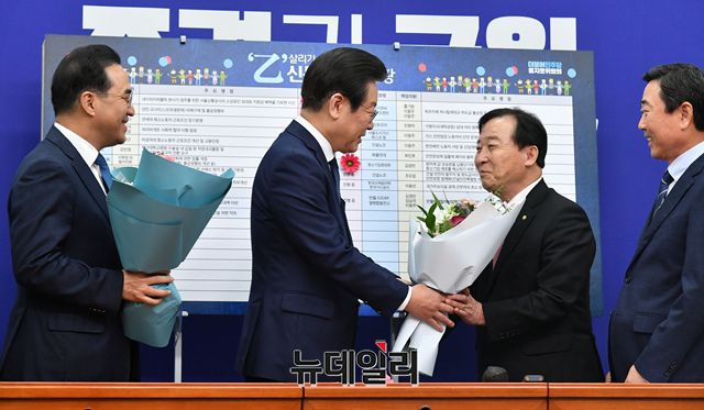 이재명 더불어민주당 대표가 21일 오전 국회에서 열린 을지로위원회 상생 꽃달기 행사에서 꽃을 달고 있다.