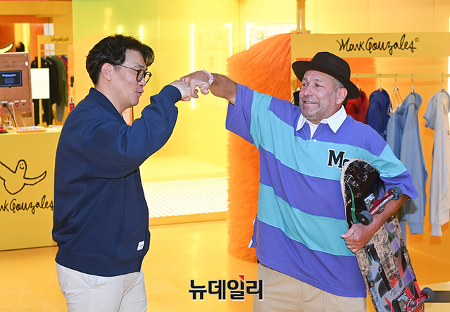 아티스트 '마크 곤잘레스(Mark Gonzales)'와 박범준 더네이쳐홀딩스 부사장이 21일 오후 서울 성동구 '마크곤잘레스 팝업스토어'에서 기념촬영을 하고 있다.