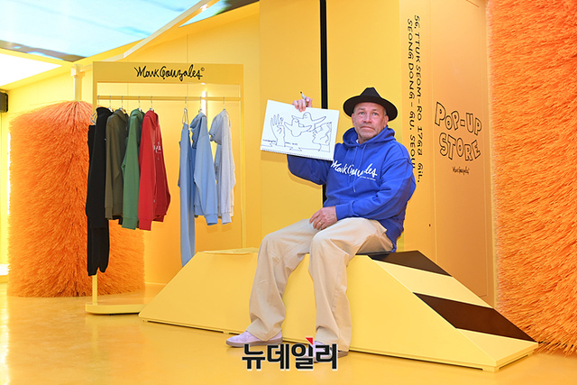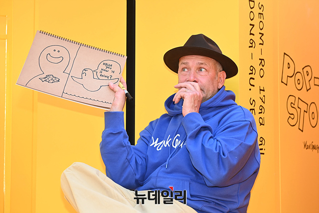 아티스트 '마크 곤잘레스(Mark Gonzales)'가 21일 오후 서울 성동구 '마크곤잘레스 팝업스토어'에서 시그니처 엔젤 로고를 선보이고 있다.