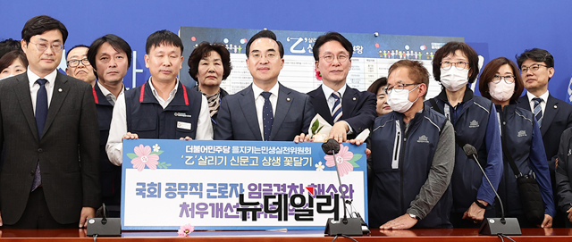 박홍근 더불어민주당 원내대표, 김민석 정책위의장 및 참석자들이 25일 오전 국회에서 열린 을지로위원회 상생 꽃달기 행사에서 기념촬영을 하고 있다.