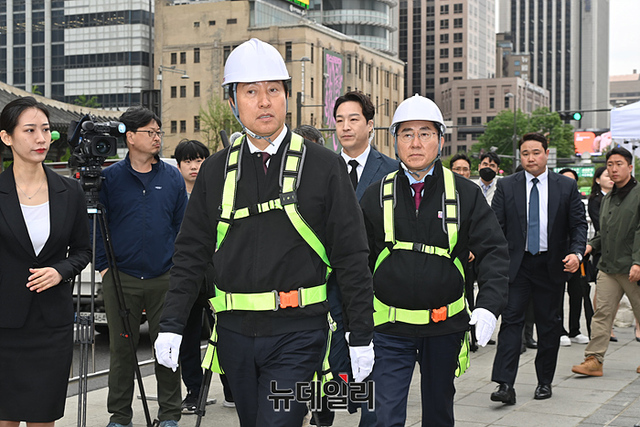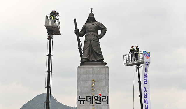 오세훈 서울시장과 박경귀 아산시장이 25일 오전 서울 광화문광장 이순신 장군 동상 앞에서 열린 '이순신 장군 동상 친수식'에서 동상의 묵은 때와 먼지를 직접 씻어내고 있다.