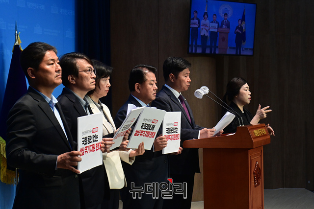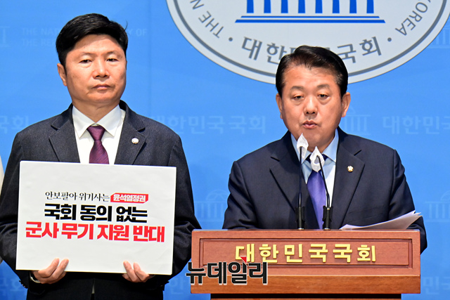 김병주 더불어민주당 의원 등 국방위 소속 의원들이 20일 오후 국회 소통관에서 열린 우크라이나 군사 지원 반대 관련 기자회견에서 발언하고 있다.