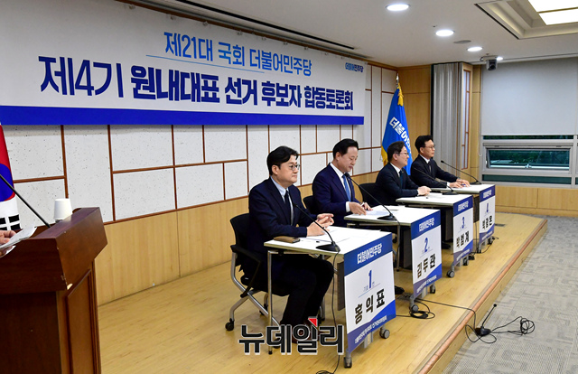 더불어민주당 원내대표 후보인 홍익표·김두관·박범계·박광온 의원이 25일 오전 국회 의원회관에서 열린 합동토론회 참석해 발언을 하고 있다.