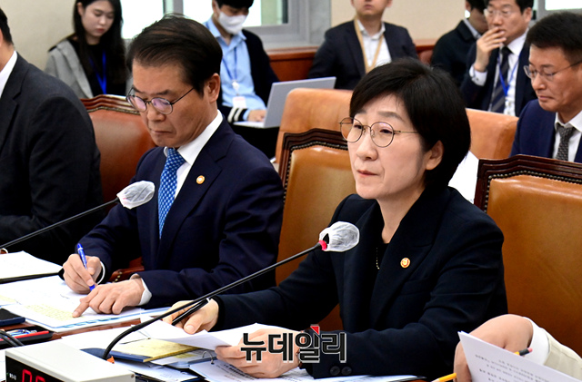 한화진 환경부 장관이 25일 오전 국회에서 환경노동위원회 전체회의에서 의원 질문 답하고 있다.