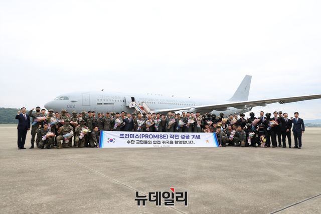 북아프리카 수단의 군벌간 무력 충돌 사태로 고립된 우리 교민 28명이 우리군 수송기로 25일 오후 경기 성남시 서울공항으로 귀국해 기념촬영을 하고 있다. (사진=공동취재단)