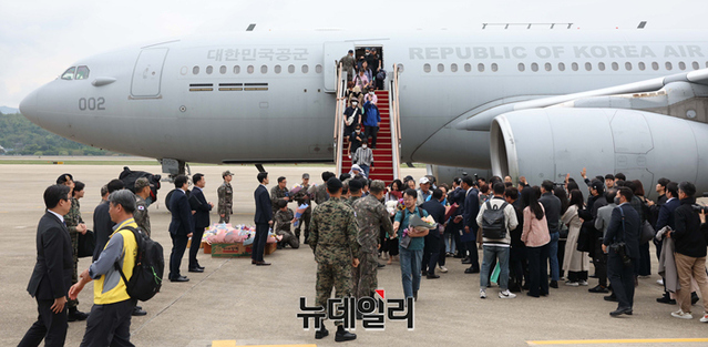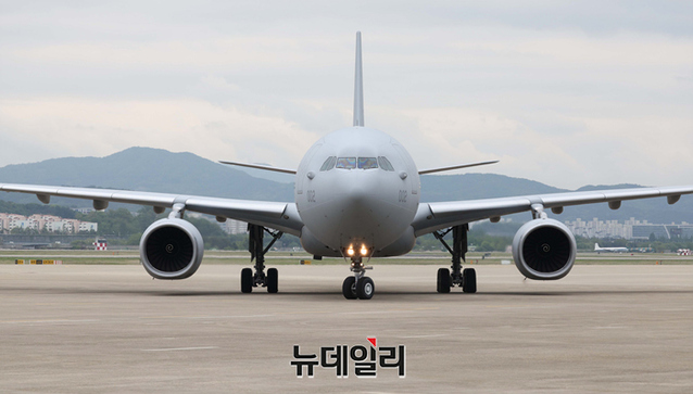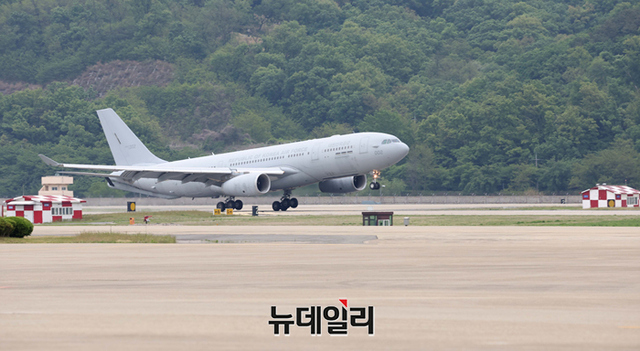 북아프리카 수단의 군벌간 무력 충돌 사태로 고립된 우리 교민 28명을 태운 군 수송기가 25일 경기 성남시 서울공항에 착륙하고 있다.이번 수송작전에 사용된 KC-330은 대한민국 공군이 도입한 공중급유기로, 국제평화유지활동과 해외재난 지원, 재외국민 구조활동 등에 활용되고 있다.KC-330은 이라크 코로나19 상황 악화로 인한 교민 및 현지 근로자 이송, 얀센 백신 긴급이송, 청해부대 코로나19 집단 감염 사건으로 파병인원 후송, 아프간 철수 작전, 튀르키예·시리아 대지진 구호물자 인원 지원등 다양한 임무에 투입됐다. (사진=공동취재단)