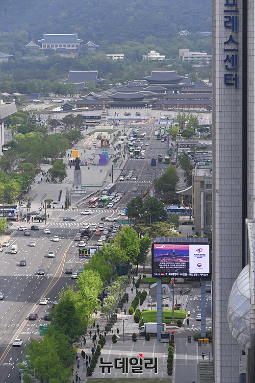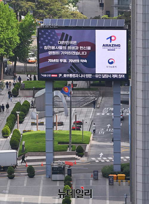 '한미동맹 70주년' 기념 영상이 25일 오후 서울 중구 한국프레스센터 전광판에 송출되고 있다. 한미 간 자유와 연대의 가치동맹, 안보동맹을 기억하고, 또 다른 70년 미래를 기약하자는 취지로 제작된 영상은 윤석열 대통령의 국빈 방미 일정에 맞춰 24일부터 서울시내 전광판 120여 개소에서 시작해 5월 1일까지 전국 150여 개소에서 확대해 송출 된다.