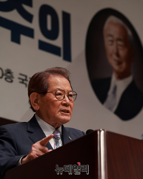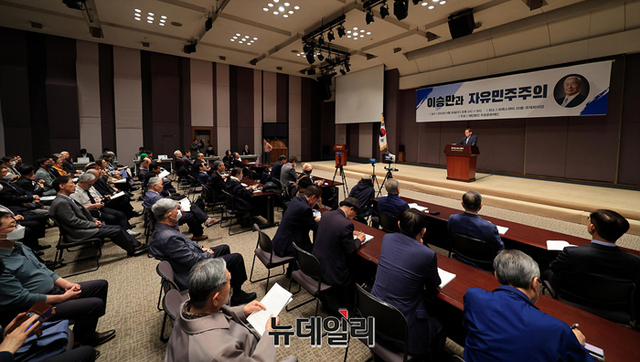 이영일 전 국회의원이 26일 오후 서울 중구 한국프레스센터에서 '이승만과 자유민주주의' 주제로 열린 우호문화재단 학술회의에서 축사를 하고 있다.