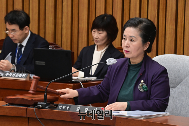 김영선 인구특위 위원장이 26일 오후 국회에서 열린 인구위기특별위원회 전체회의에서 의사봉을 두드리고 있다.