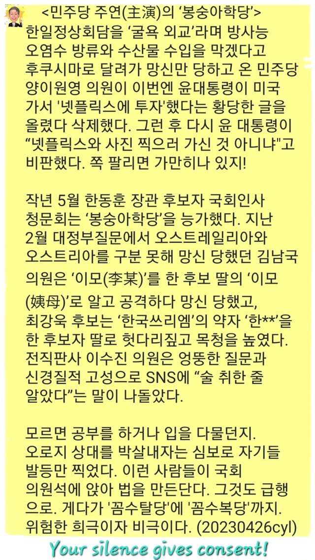 ■ 민주당 주연(主演)의 ‘봉숭아학당’ ■한일정상회담을 ‘굴욕 외교’라며 방사능오염수 방류와 수산물 수입을 막겠다고 후쿠시마로 달려가 망신만 당하고 온 민주당 양이원영 의원이 이번엔 윤대통령이 미국 가서 '넷플릭스에 투자'했다는 황당한 글을 올렸다 삭제했다.
