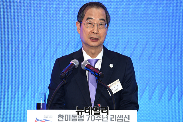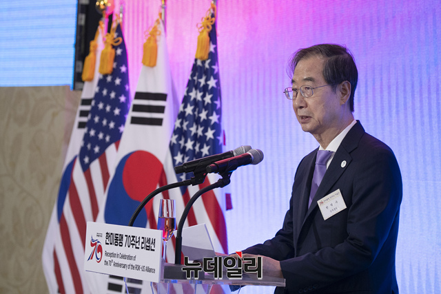 한덕수 국무총리가 26일 오후 국회 로텐더 홀에서 열린 한미동맹 70주년 기념 리셉션 행사에서 축사를 하고 있다. (사진=공동취재단)