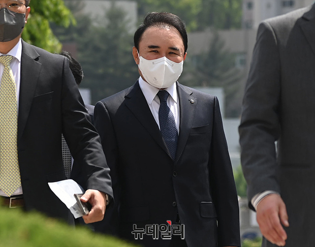 윤홍근 제너시스BBQ 회장이 27일 오전 경기 성남시 수원지방법원 성남지원에서 진행된 특정경제범죄가중처벌등에관한법률위반 관련 공판에 출석하고 있다. (경기 성남=서성진 기자)