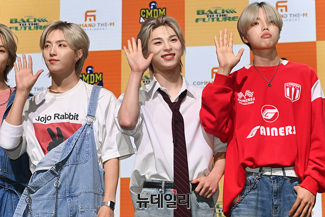 신인 보이그룹 커맨더맨(왼쪽부터 승호, 현하, 희주, 병훈, 노율, 준형)이 27일 오후 서울 마포구 신한pLay 스퀘어에서 열린 'BACK TO THE FUTURE' 데뷔 기념 쇼케이스에서 포토타임을 갖고 있다.