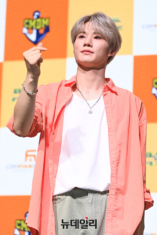 신인 보이그룹 커맨더맨(CMDM) 승호가 27일 오후 서울 마포구 신한pLay 스퀘어에서 열린 'BACK TO THE FUTURE' 데뷔 기념 쇼케이스에서 포토타임을 갖고 있다.