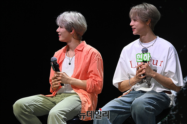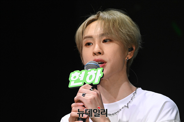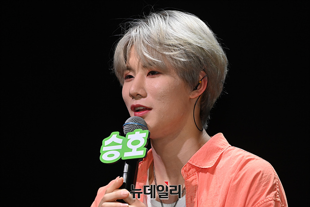 신인 보이그룹 커맨더맨(CMDM)이 27일 오후 서울 마포구 신한pLay 스퀘어에서 열린 데뷔 기념 쇼케이스에서 앨범을 소개하고 있다.