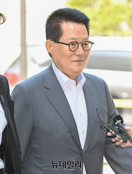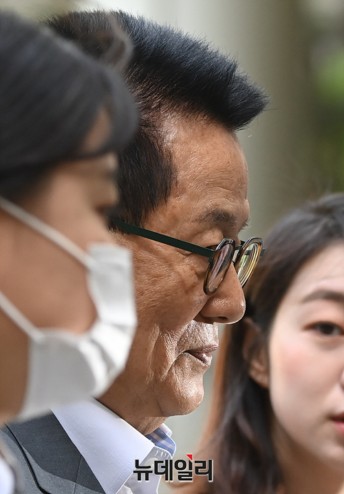 서해 공무원 피격사건 은폐 관련 혐의로 기소된 박지원 전 국정원장이 28일 오전 서울 서초구 중앙지법에서 열린 공판에 출석하고 있다.