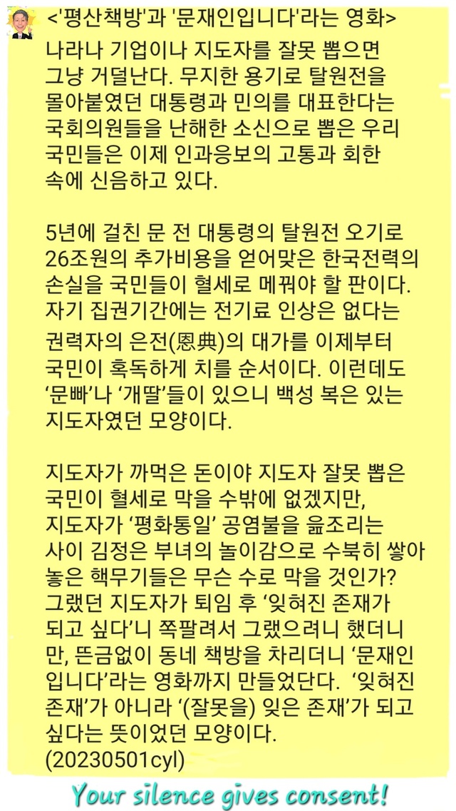 무지한 용기로 탈원전을 몰아붙였던 대통령과 민의를 대표한다는 국회의원들을 난해한 소신으로 뽑은 우리 국민들은 이제 인과응보의 고통과 회한 속에 신음하고 있다.5년에 걸친 문 전 대통령의 탈원전 오기(傲氣)로 26조원의 추가비용을 얻어맞은 한국전력의 손실을 국민들이 혈세로 메꿔야 할 판이다.