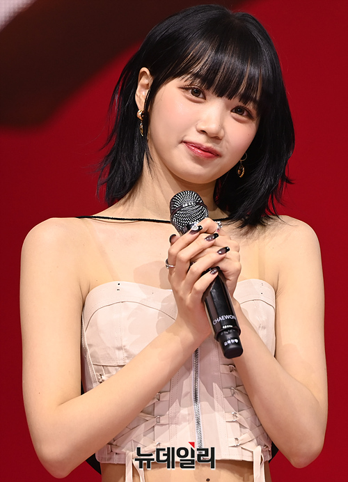 걸그룹 르세라핌(LE SSERAFIM)이 1일 오후 서울 광진구 예스24라이브홀에서 열린 첫 번째 정규 앨범 'UNFORGIVEN' 발매 기념 쇼케이스에서 앨범소개를 하고 있다.