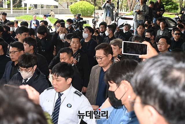 더불어민주당 '2021년 전당대회 돈봉투 의혹'의 핵심 피의자로 지목된 송영길 전 민주당 대표가 2일 오전 서울중앙지검으로 자진출석한 직후 로비에서 발걸음을 돌리고 있다. 검찰은 조사 일정이 잡히지 않았다며 청사 로비에서 송 전 대표를 돌려보냈다.