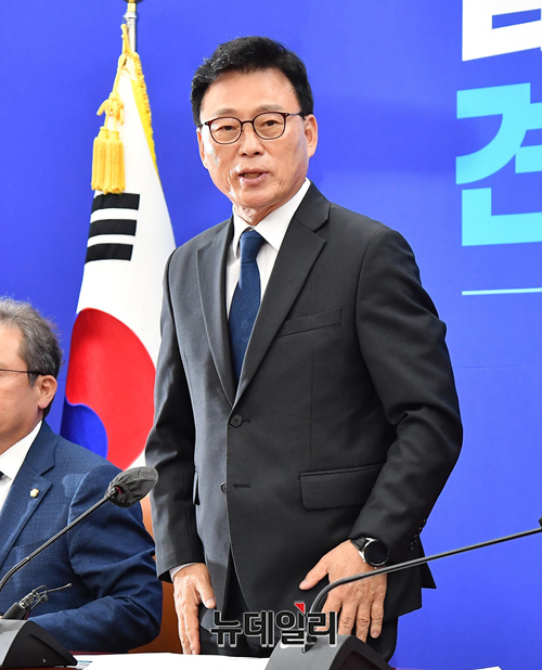 박광온 더불어민주당 신임 원내대표가 2일 오전 국회에서 열린 원내대책회의에서 인사를 하고 있다.