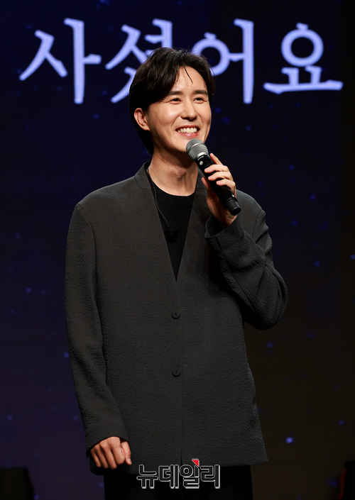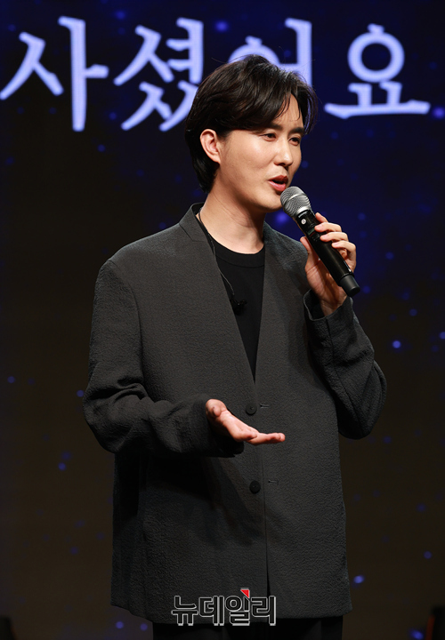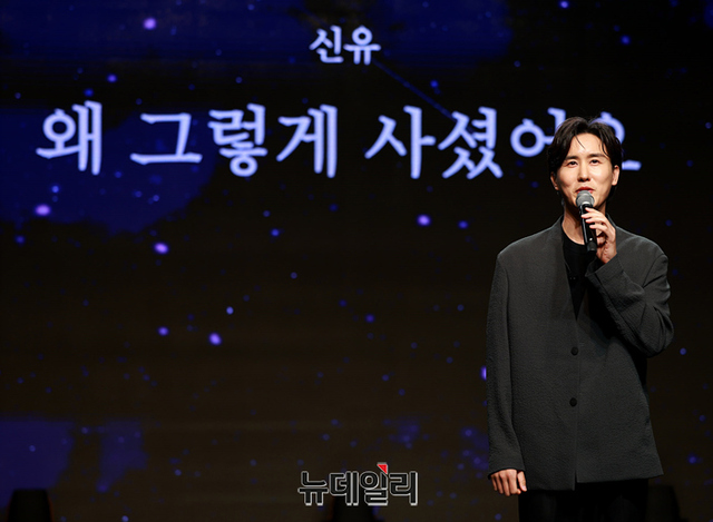 트로트 가수 신유가 2일 오후 서울 강남구 일지아트홀에서 열린 신곡 '왜 그렇게 사셨어요' 쇼케이스에서 인사말을 하고 있다.