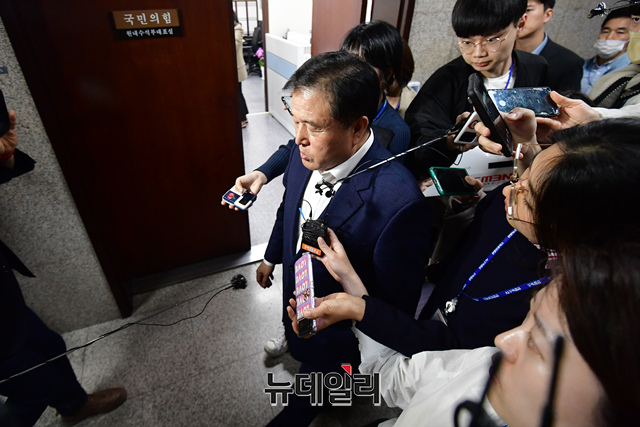 이진복 대통령비서실 정무수석이 2일 오후 국회에서 박광온 더불어민주당 원내대표를 예방하기 위해 국회로 들어서며 취재진 질문에 답하고 있다.