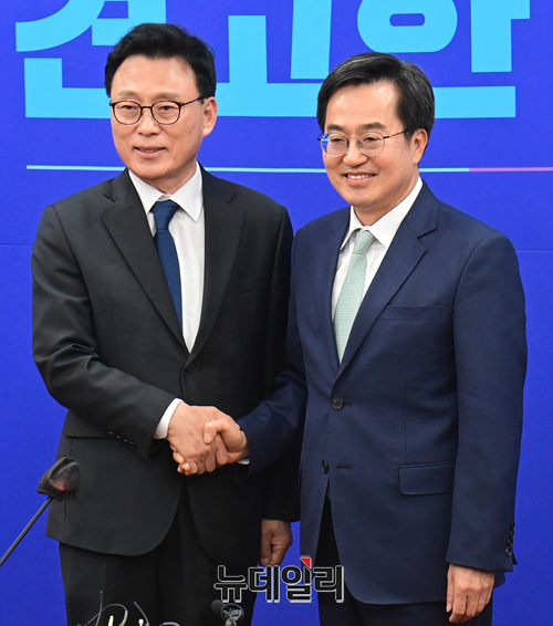 박광온 더불어민주당 원내대표가 2일 오후 국회 원내대표실을 방문한 김동연 경기도지사와 기념촬영을 하고 있다.