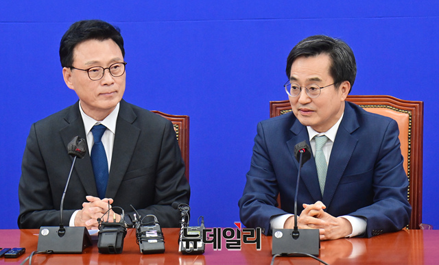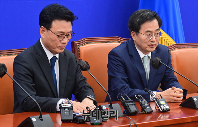 박광온 더불어민주당 원내대표가 2일 오후 국회 원내대표실을 방문한 김동연 경기도지사와 환담을 나누고 있다.