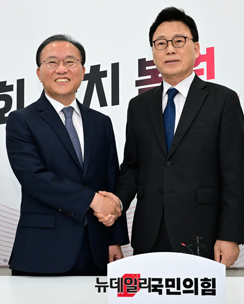 박광온 더불어민주당 원내대표가 2일 오후 국회에서 윤재옥 국민의힘 원내대표를 예방해 악수하고 있다.