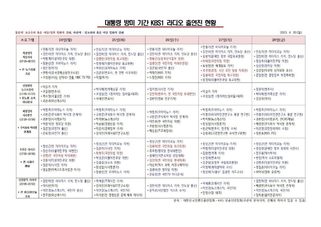 지난주 윤석열 대통령의 국빈 방미 기간, 총 5개의 KBS 라디오 프로그램에 출연한 패널 가운데 '좌파 혹은 친야당 성향 인사'가 80명에 달한 반면 '우파 혹은 친여당 성향 패널'은 11명에 그쳐 심각한 불균형을 이룬 것으로 드러났다.