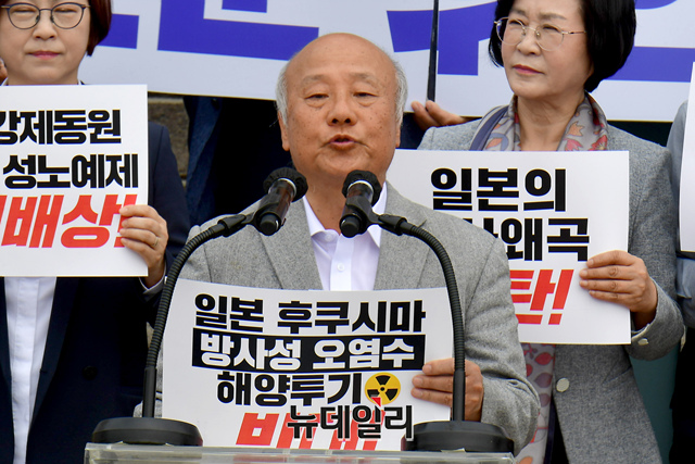 더불어민주당 대일굴욕외교대책위원회, 강제동원의원모임, 역사정의평화행동, 후쿠시마오염수 공동행동이 4일 오전 국회 본청 계단에서 '기시다 일본 총리 방한' 관련 공동 기자회견을 하고 있다