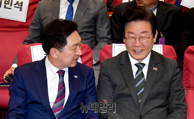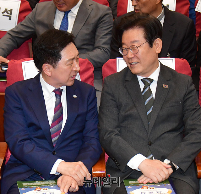 김기현 국민의힘 대표와 이재명 더불어민주당 대표가 4일 오전 국회 의원회관에서 열린 어린이 안전 헌장 선포식에서 대화를 나누고 있다.