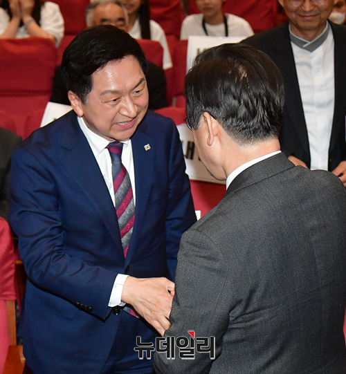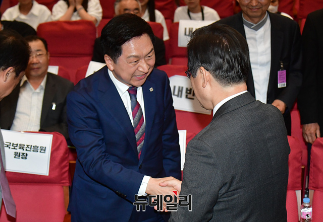 김기현 국민의힘 대표와 이재명 더불어민주당 대표가 4일 오전 국회 의원회관에서 열린 어린이 안전 헌장 선포식에서 악수를 나누고 있다.