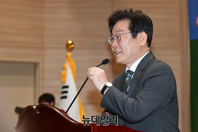 이재명 더불어민주당 대표가 4일 오전 국회 의원회관에서 열린 어린이 안전 헌장 선포식에서 축사를 하고 있다.