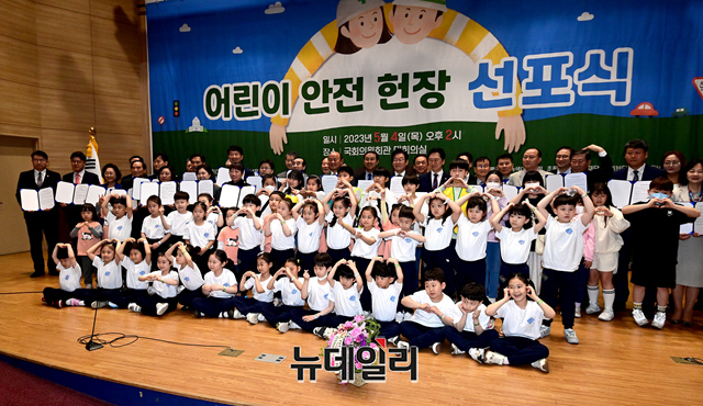 김기현 국민의힘 대표, 이재명 더불어민주당 대표 및 어린이들이 4일 국회 의원회관에서 열린 어린이 안전 헌장 선포식에서 안전 헌장 선포 퍼포먼스를 하고 있다.