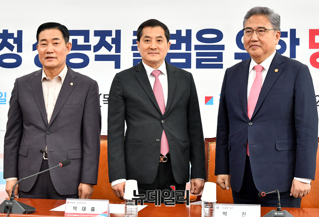 박진 외교부 장관, 박대출 국민의힘 정책위의장, 신원식 제4정조위원장이 4일 오후 국회에서 열린 재외동포청 성공적 출범을 위한 당정협의회에서 기념촬영하고 있다.