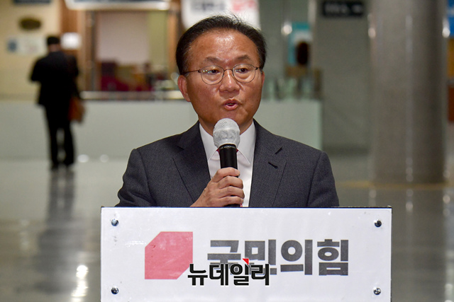 윤재옥 국민의힘 원내대표가 8일 오전 국회 의원회관에서 열린 '윤석열 정부 출범 1주년 사진전 다시 경제다!'에서 축사를 하고 있다.