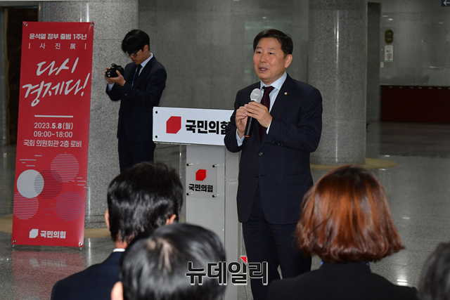 이철규 국민의힘 사무총장이 8일 오전 국회 의원회관에서 열린 '윤석열 정부 출범 1주년 사진전 다시 경제다!'에서 축사를 하고 있다.
