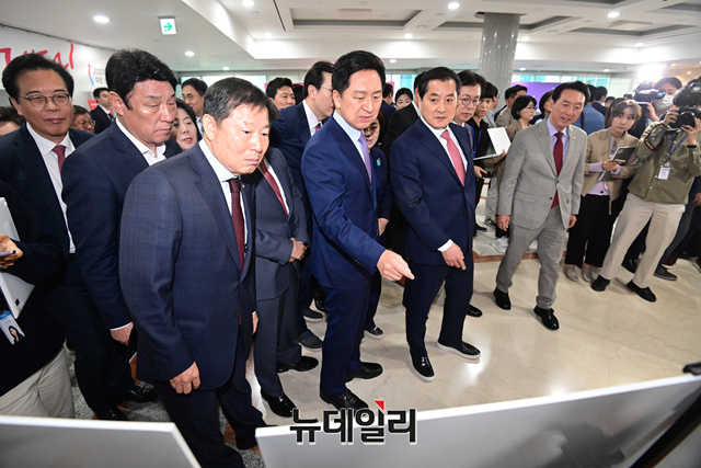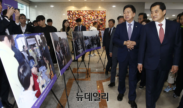 김기현 국민의힘 당대표와 윤재옥 원내대표 및 지도부가 8일 오전 국회에서 열린 '윤석열 정부 출범 1주년 사진전'에 참석해 사진을 둘러보고 있다.