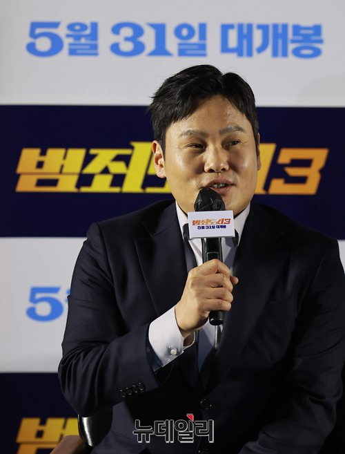 이상용 영화감독이 9일 오전 서울 강남구 메가박스 코엑스에서 열린 영화 '범죄도시3(연출 이상용)' 제작보고회에서 인사말을 하고 있다.