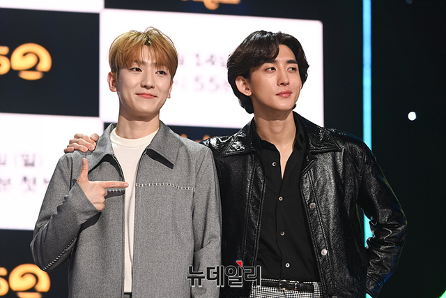 멜로망스 정동환(왼쪽)과 잔나비 최정훈이 9일 오후 서울 여의도 KBS에서 열린 '더 시즌즈-최정훈의 밤의 공원' 제작발표회에서 포토타임을 갖고 있다.