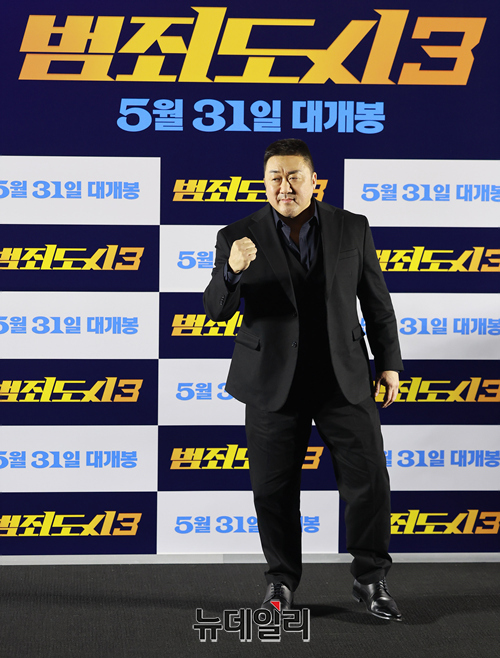배우 마동석이 9일 오전 서울 강남구 메가박스 코엑스에서 열린 영화 '범죄도시3(연출 이상용)' 제작보고회에서 포토타임을 갖고 있다.