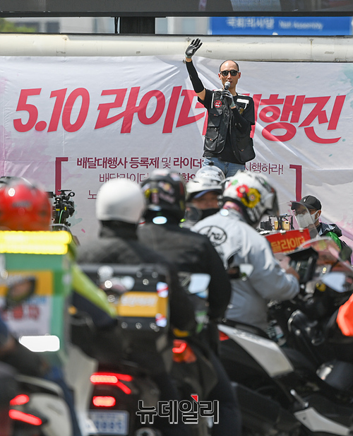 민노총 공공운수노조 라이더유니온이 10일 오후 서울 여의도 국회의사당 앞에서 열린 '2023 라이더대행진'에 앞서 집회를 진행하고 있다.