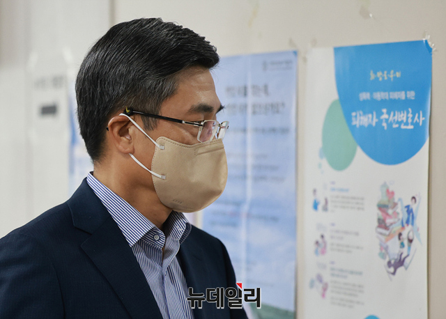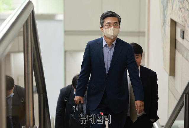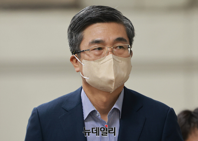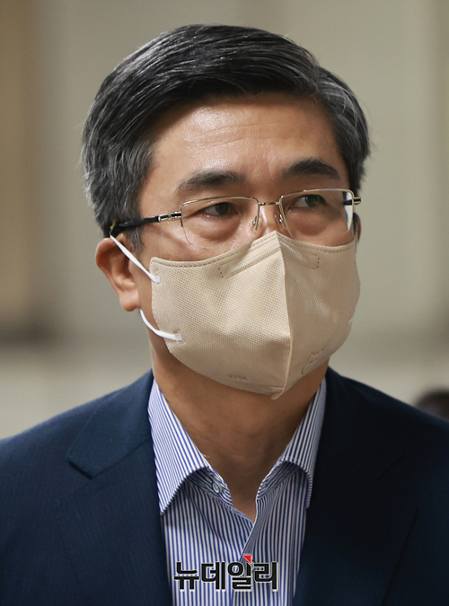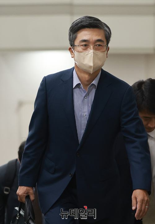 서욱 전 국방부 장관이 12일 오전 서울 서초구 중앙지법에서 열린 '서해 피격 사건' 관련 5차 공판에 출석하고 있다.