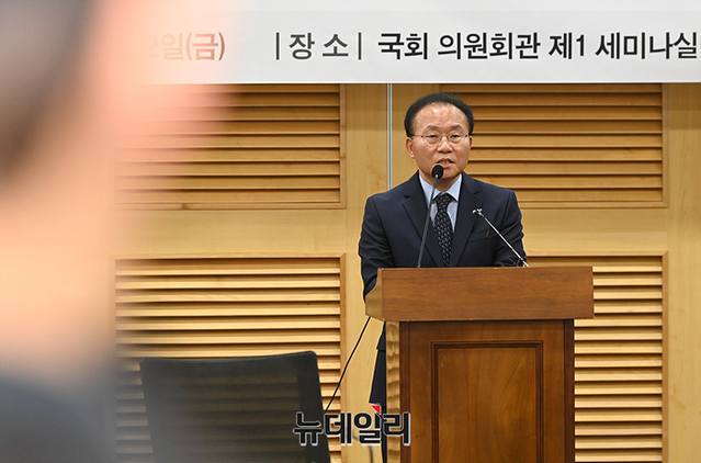 윤재옥 국민의힘 원내대표가 12일 오전 국회 의원회관 제1 세미나실에서 열린 한국정치평론가 협회 출범식 및 기념 세미나에서 축사를 하고 있다.