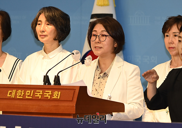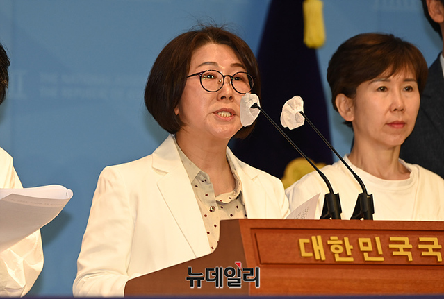 정연 전국직업계고 간호교육교장협의회장이 12일 오전 국회 소통관에서 간호법 제정안 중 '간호조무사 자격 기준' 문제 관련 입장을 밝히고 있다.
