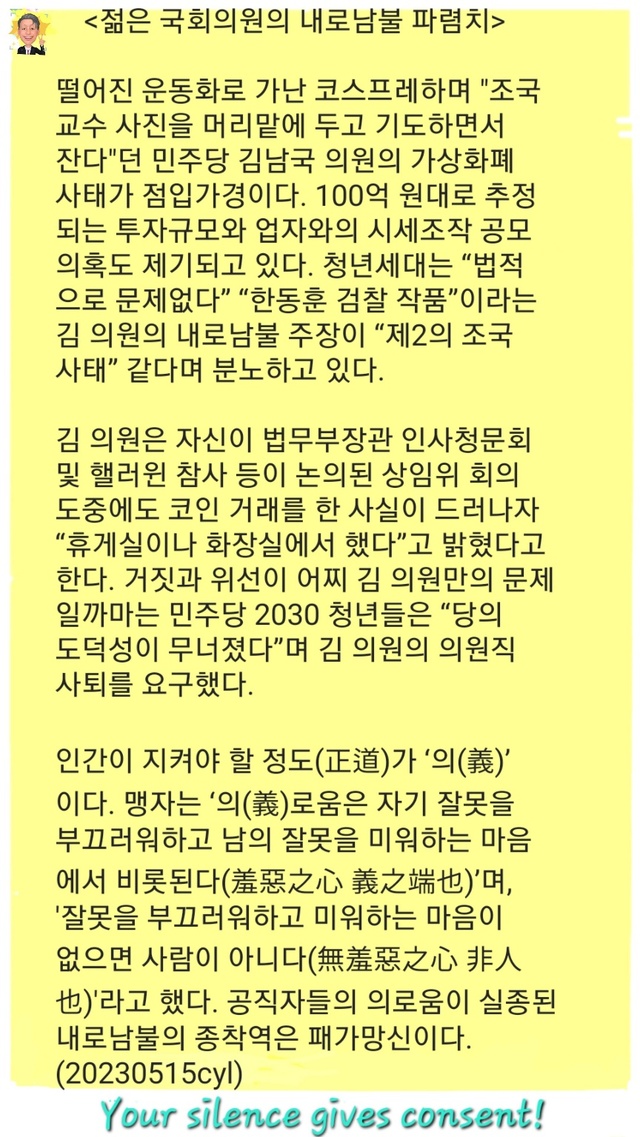 ■ 젊은 국회의원의 내로남불 파렴치 ■떨어진 운동화로 가난 코스프레하며 "조국 교수 사진을 머리맡에 두고 기도하면서 잔다"던 민주당 김남국 의원의 가상화폐 사태가 점입가경이다.